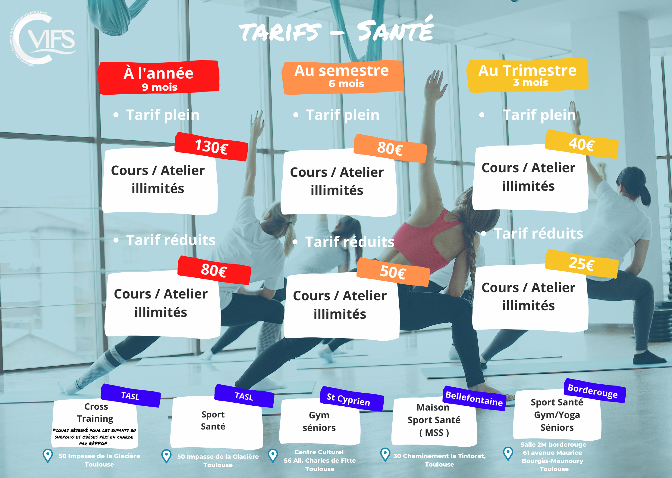 Nous avons des séances sport-santé sur différents sites, dans l’objectif de faciliter l’accès à une AP régulière au plus grand nombre. Nos tarifs sont proposés à l’année, au semestre ou au trimestre selon le programme « A mon rythme de l’UFOLEP », fédération à laquelle nous sommes affiliés et qui nous accompagne sur notre Maison Sport Santé.