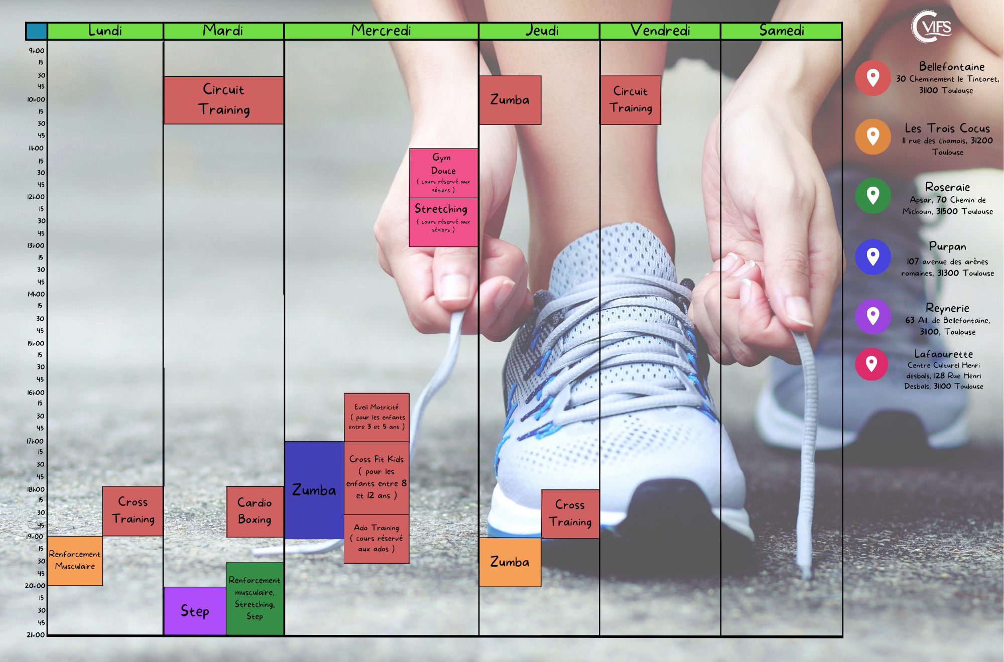 – Cross fit kids : Le Cross–Training, est un entraînement intensif de type circuit-training où l’on doit réaliser plusieurs exercices dans un temps donné adapté pour les enfants.